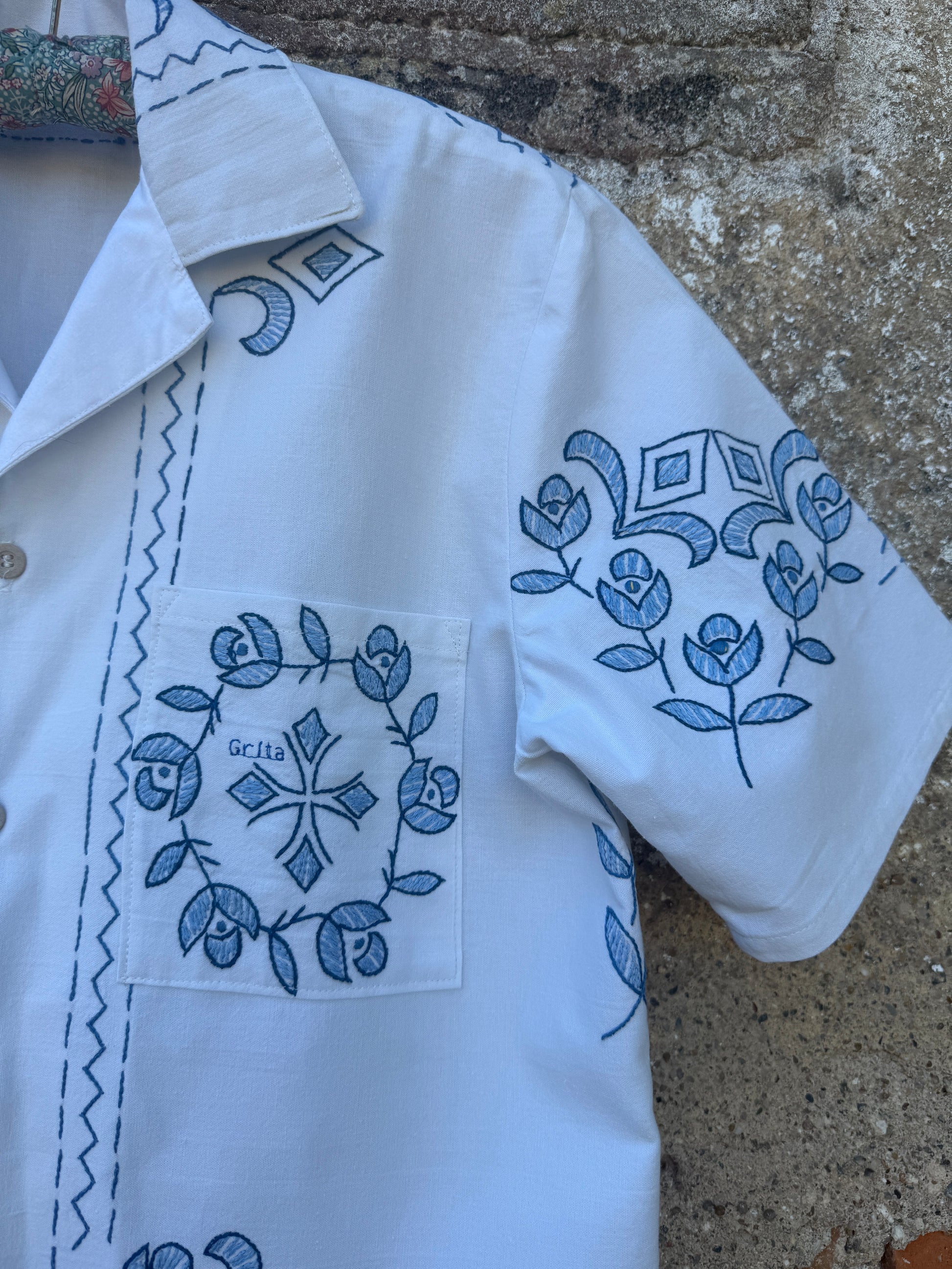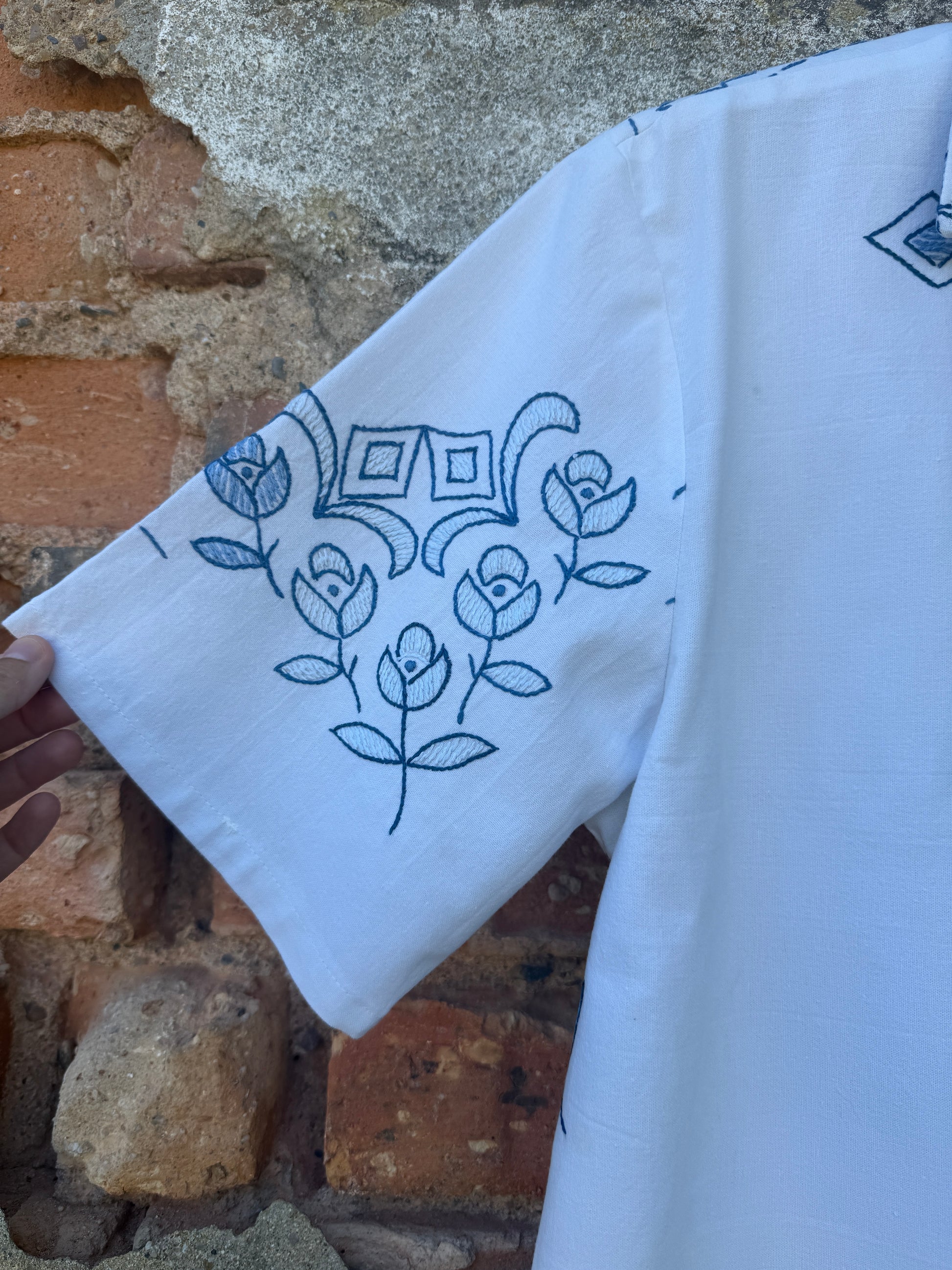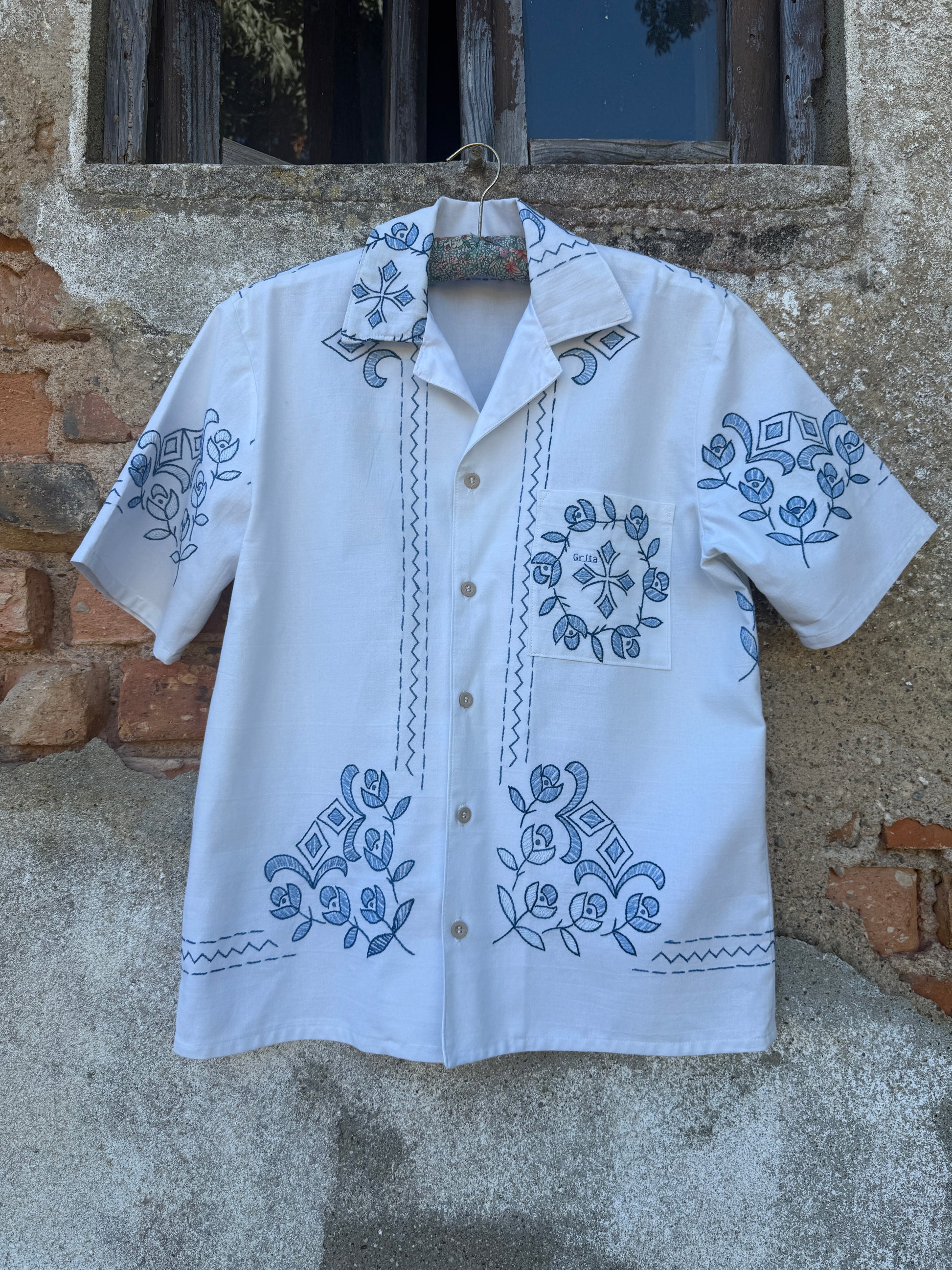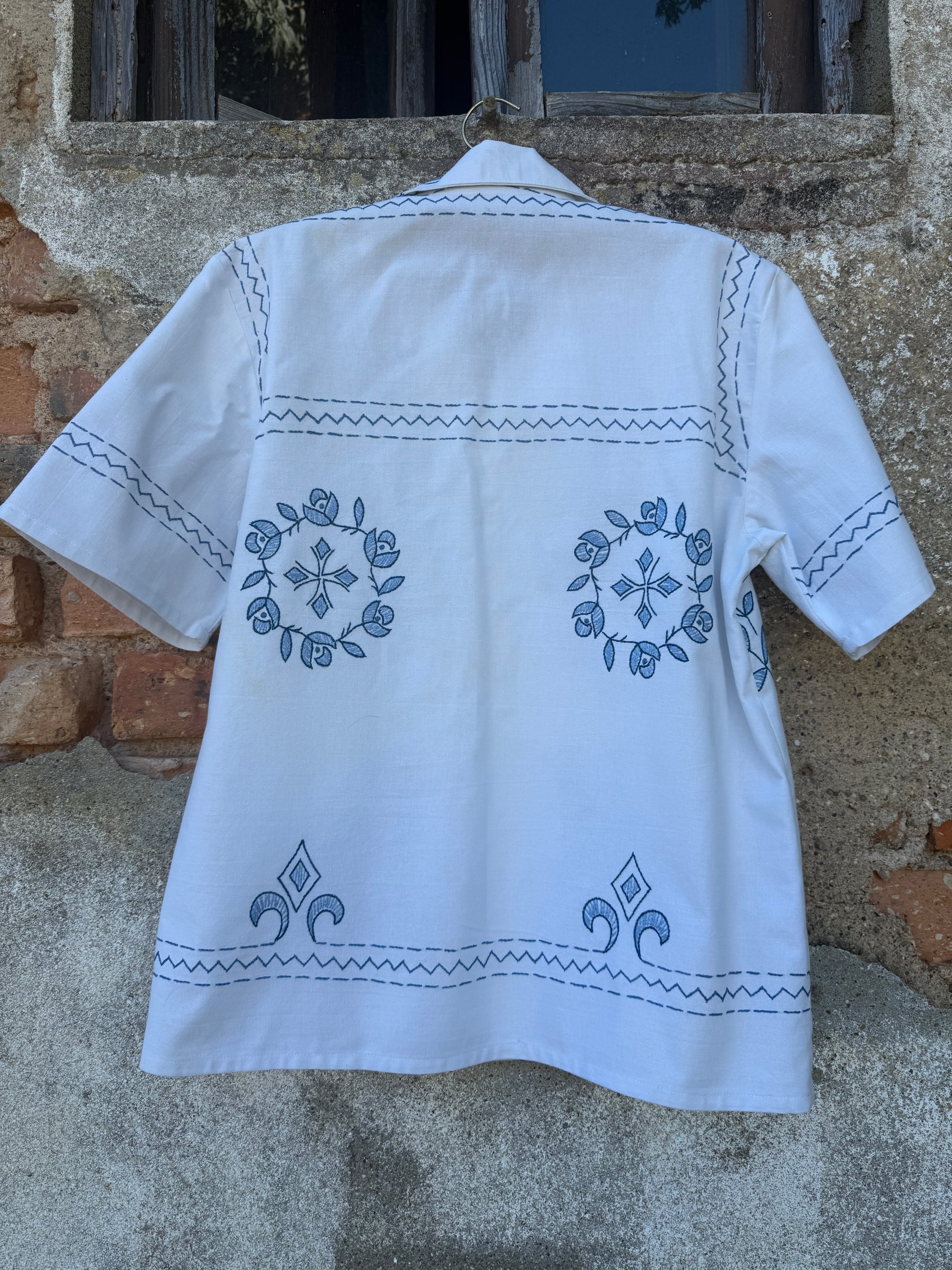 Beautiful shirt, made from a linen tablecloth and hand-embroidered.