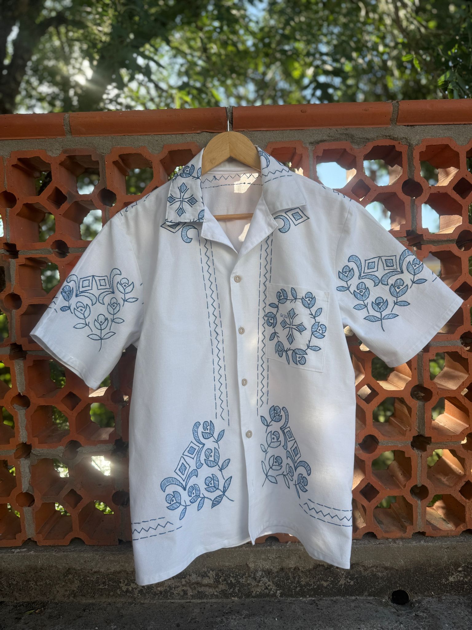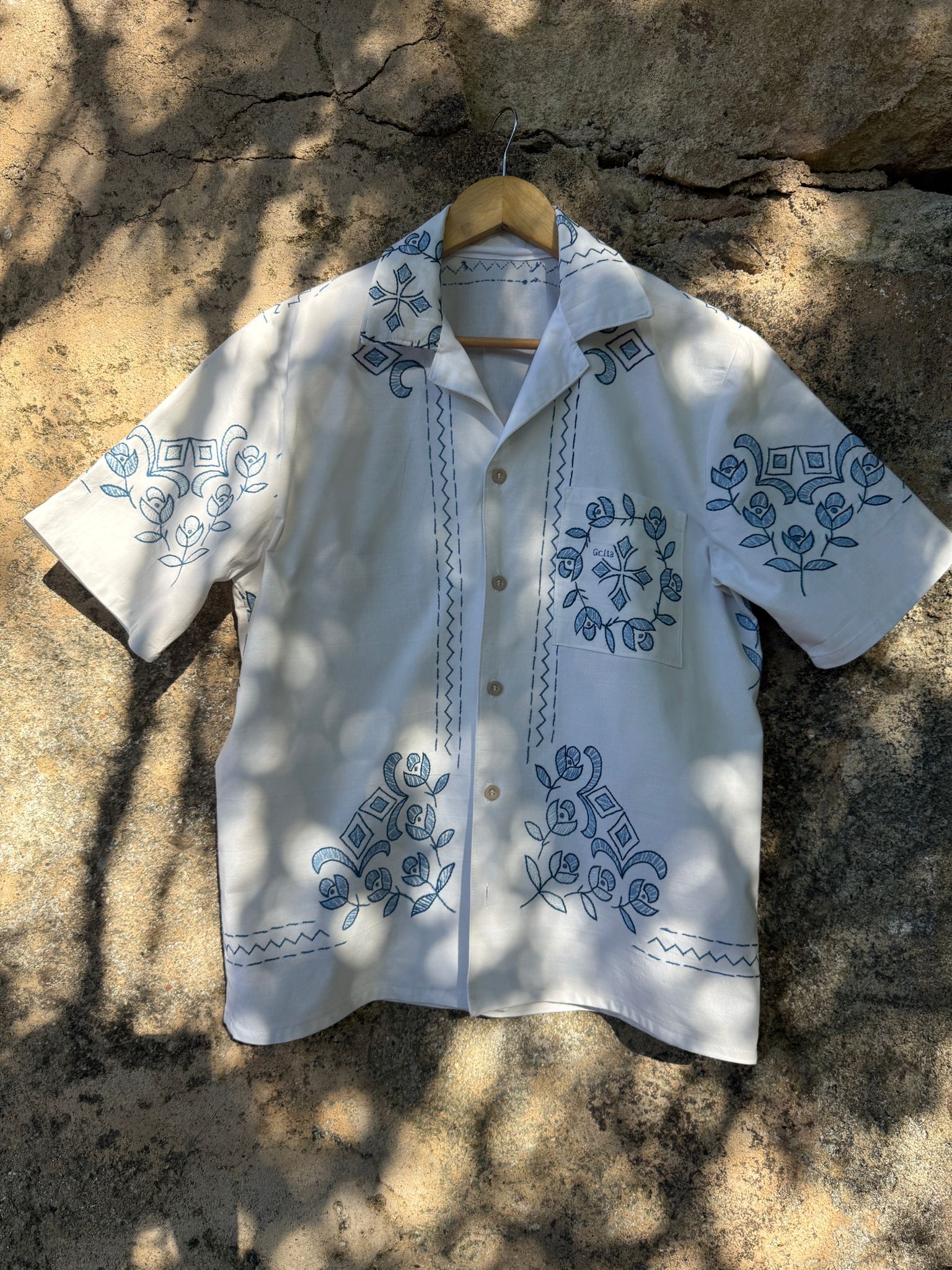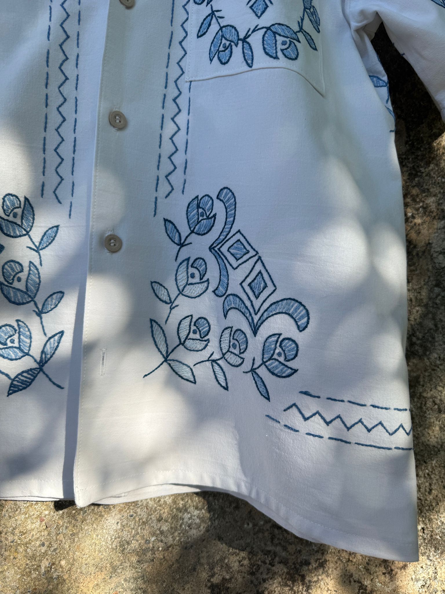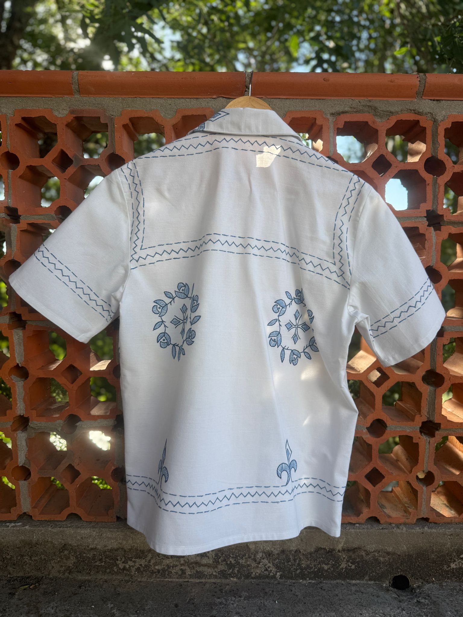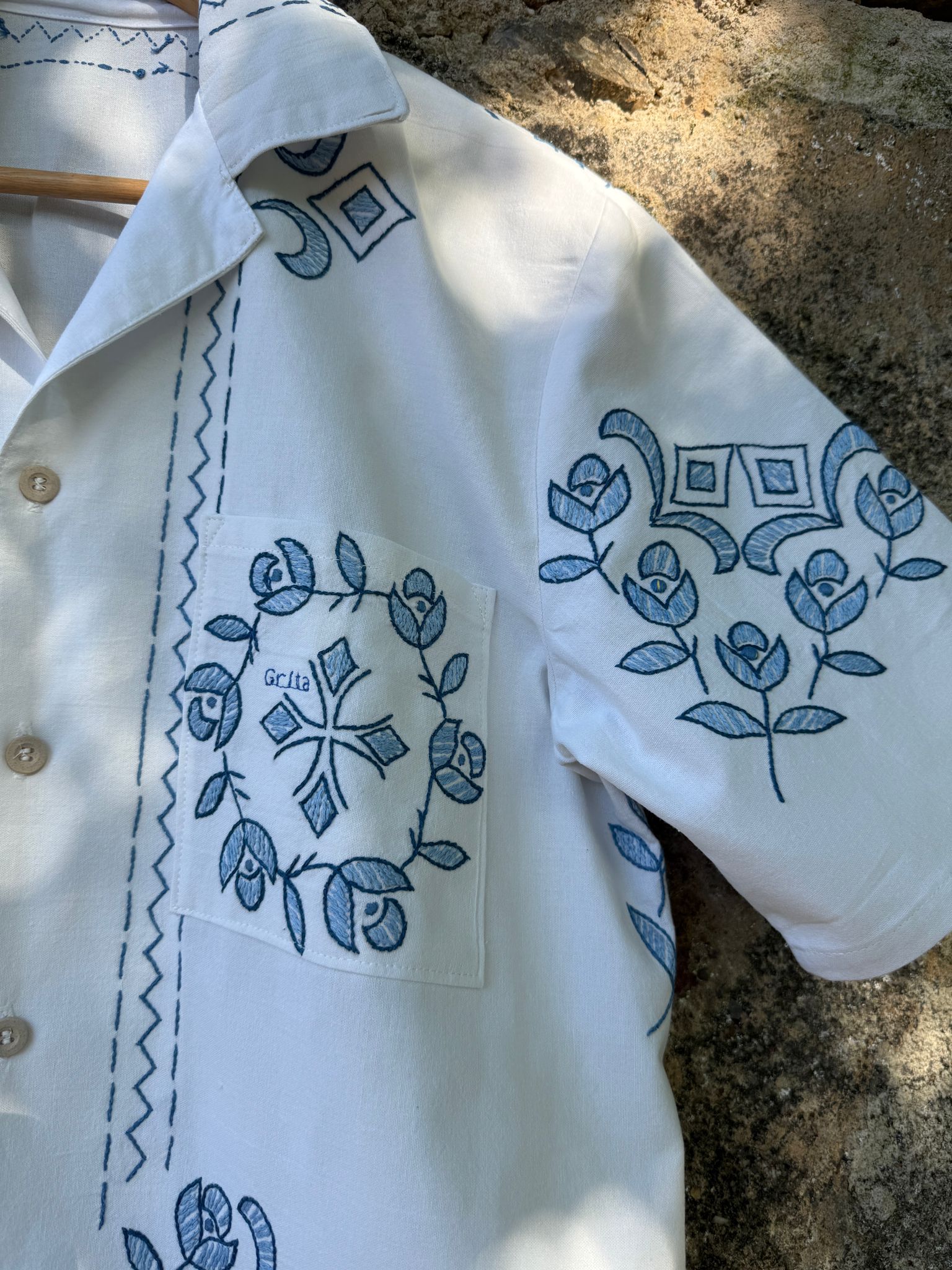 Beautiful shirt, made from a linen tablecloth and hand-embroidered.