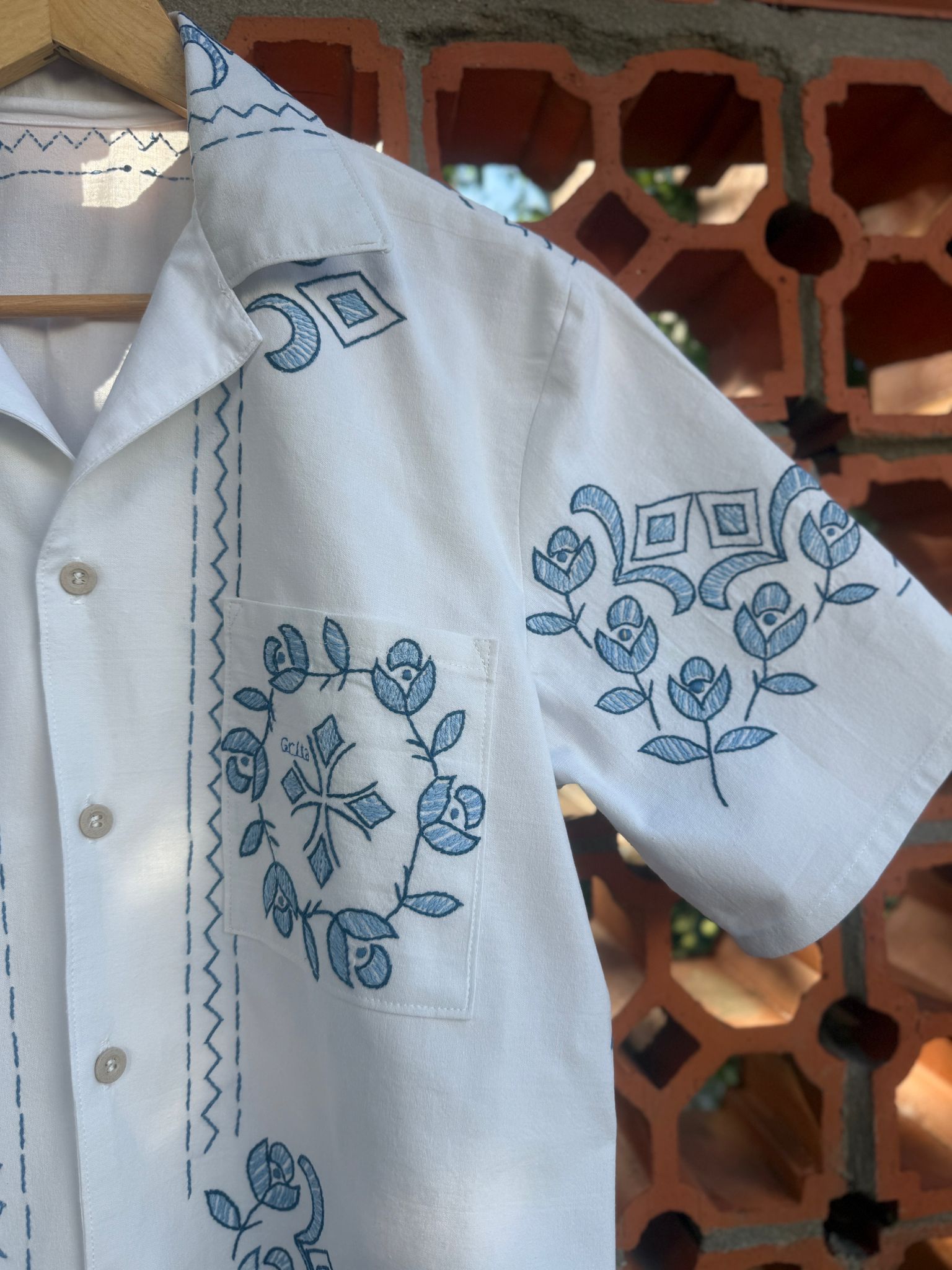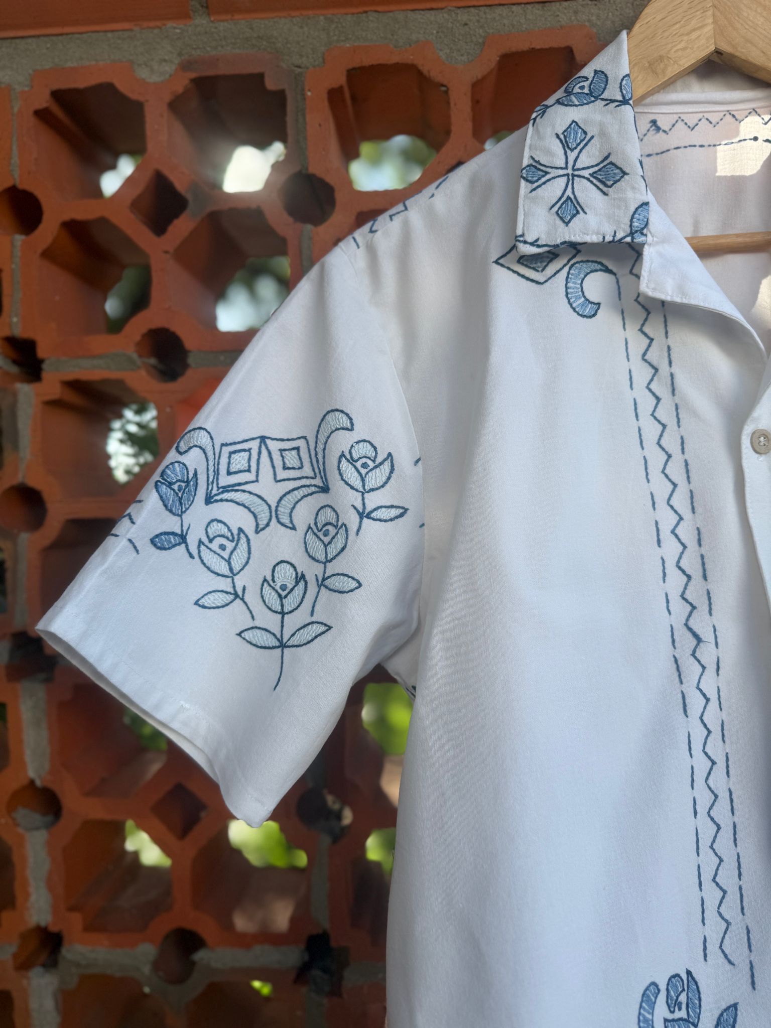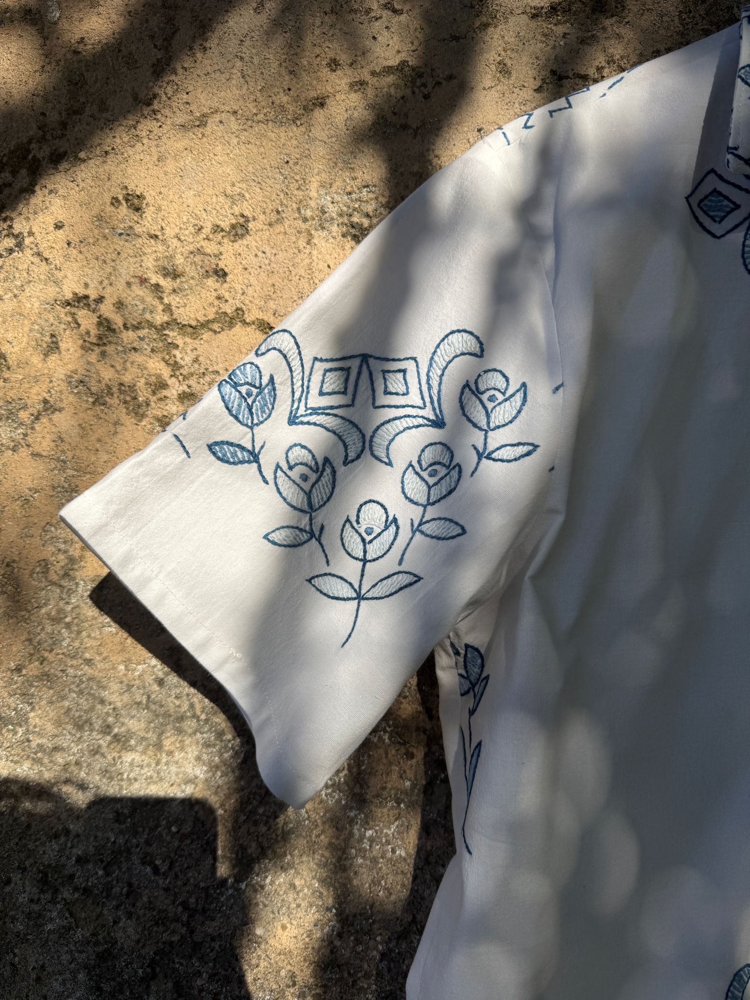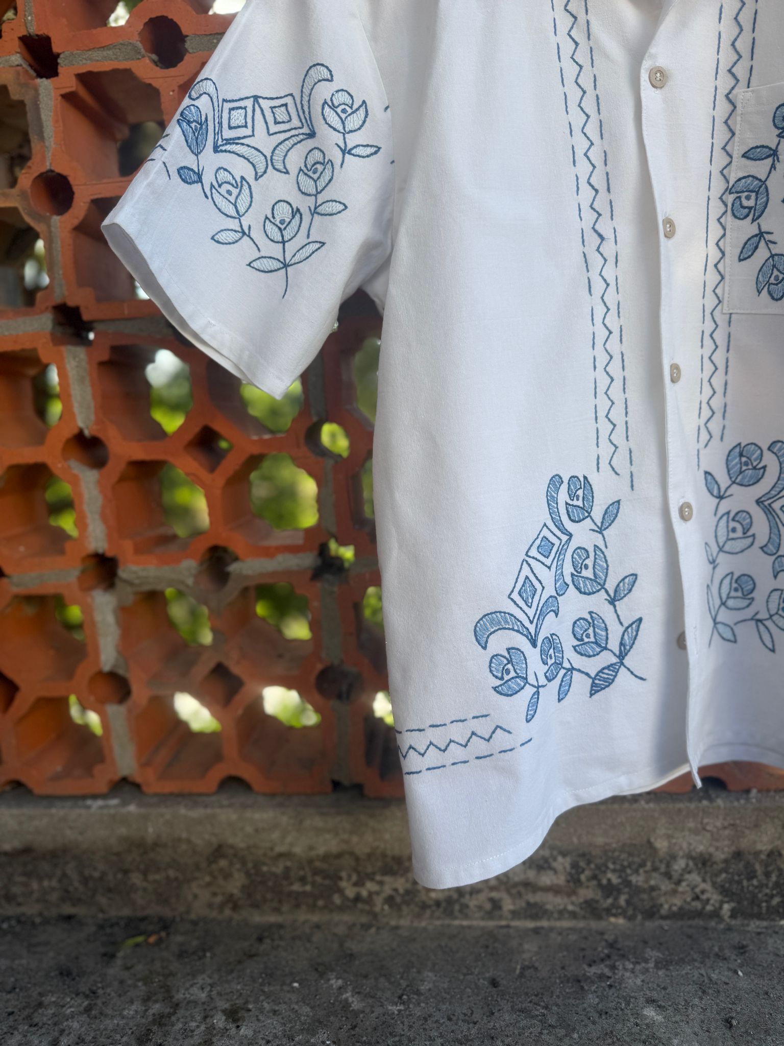 Beautiful shirt, made from a linen tablecloth and hand-embroidered.
