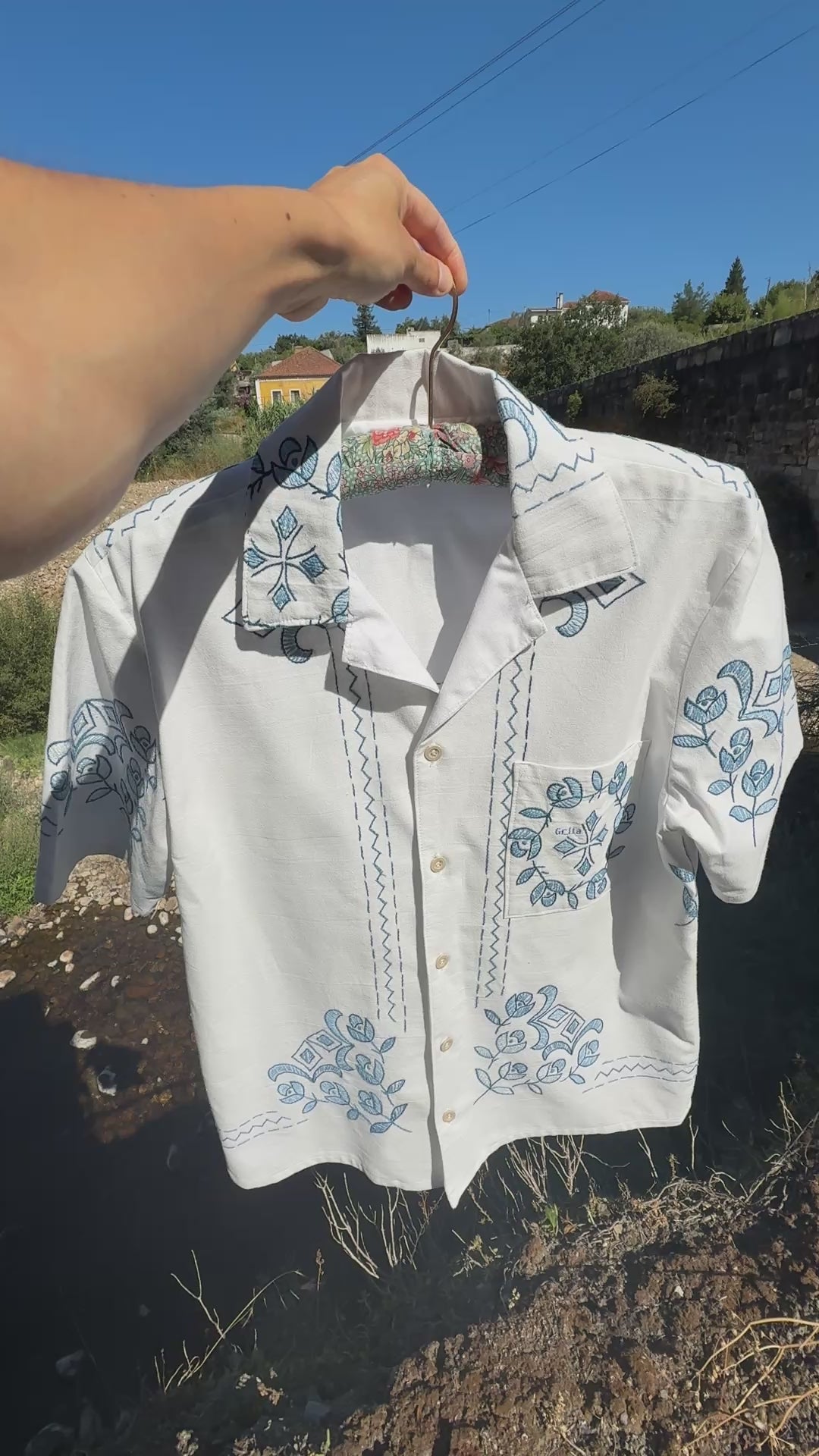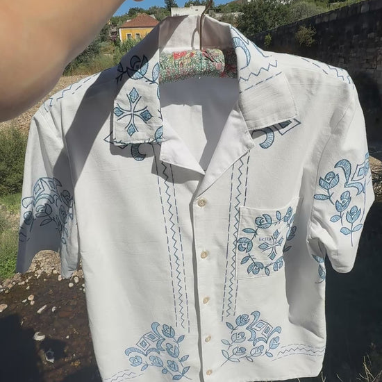 Bonita camisa, feita com uma toalha de mesa em linho e bordada à mão.