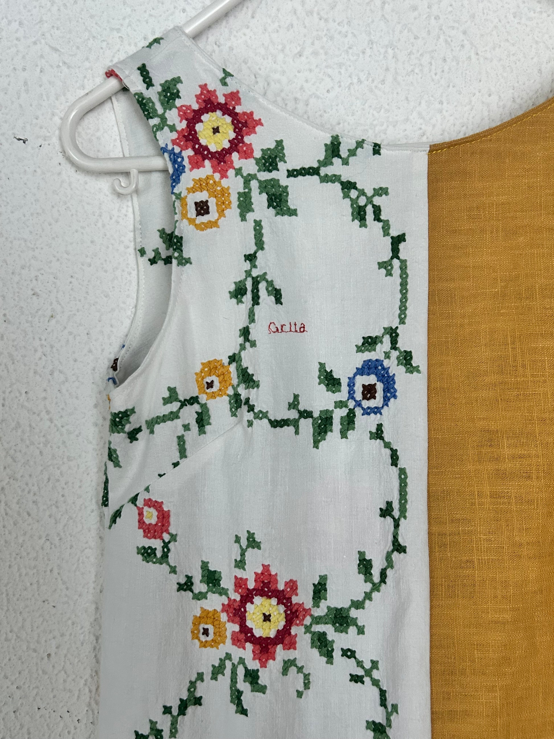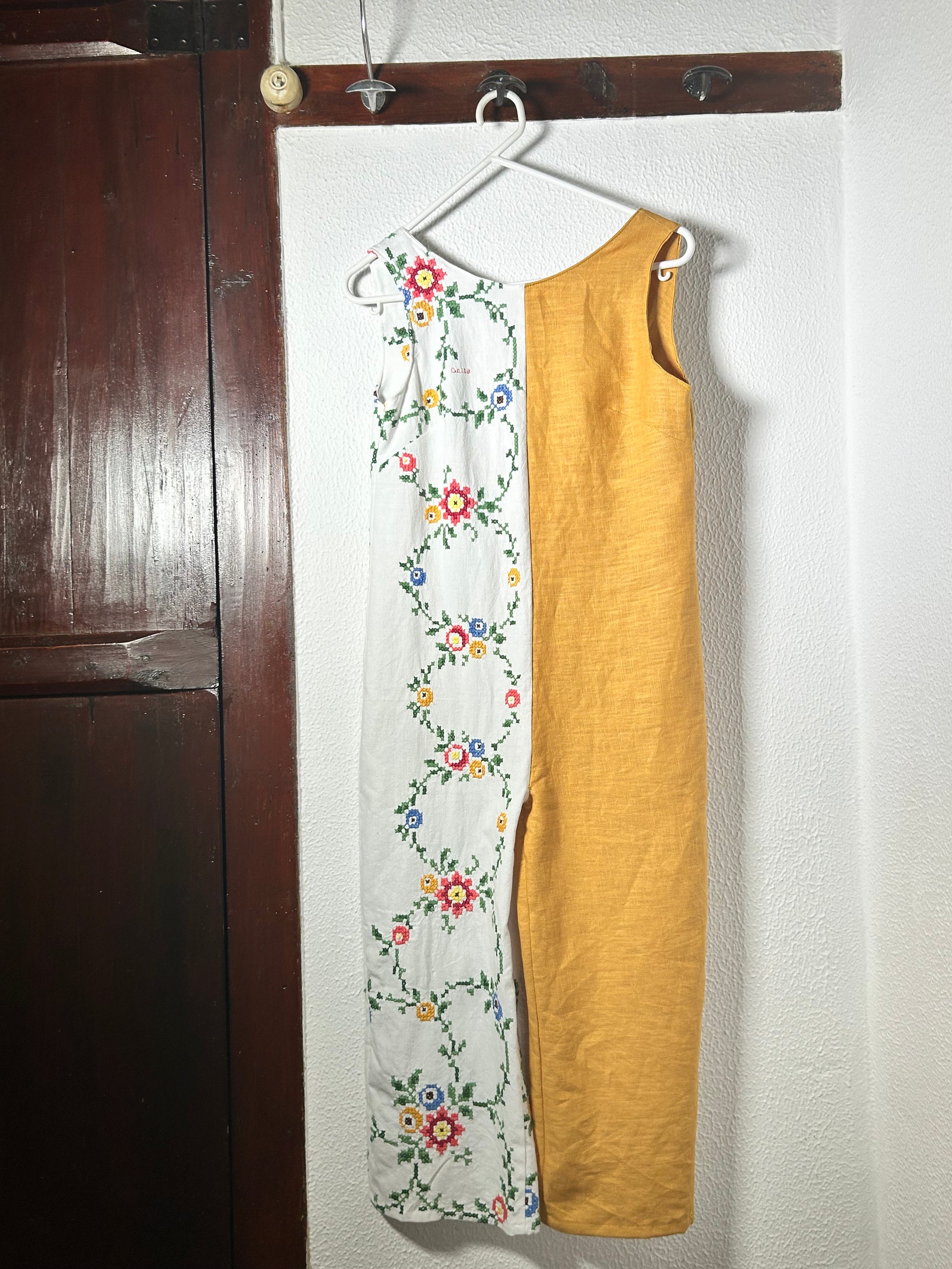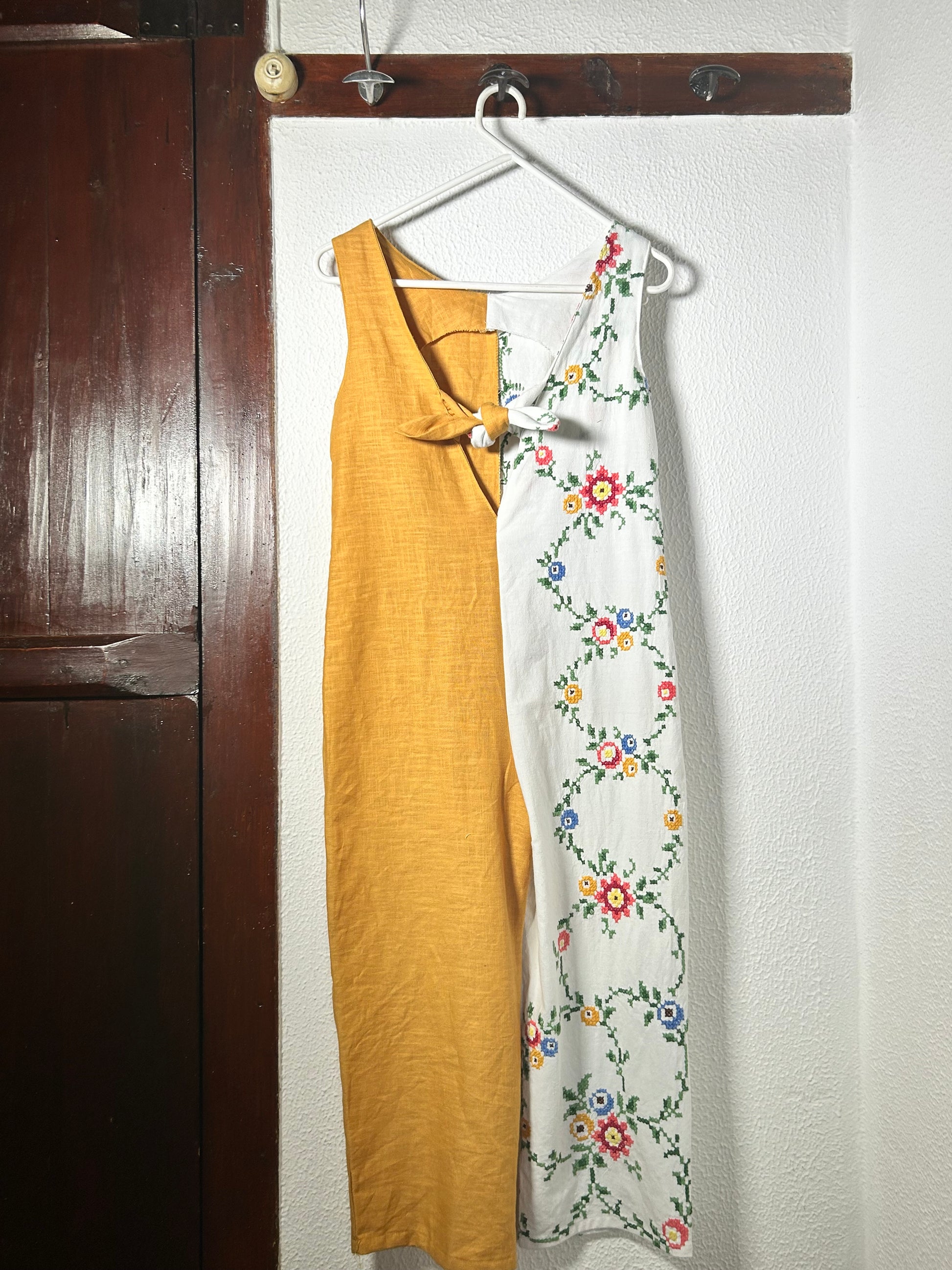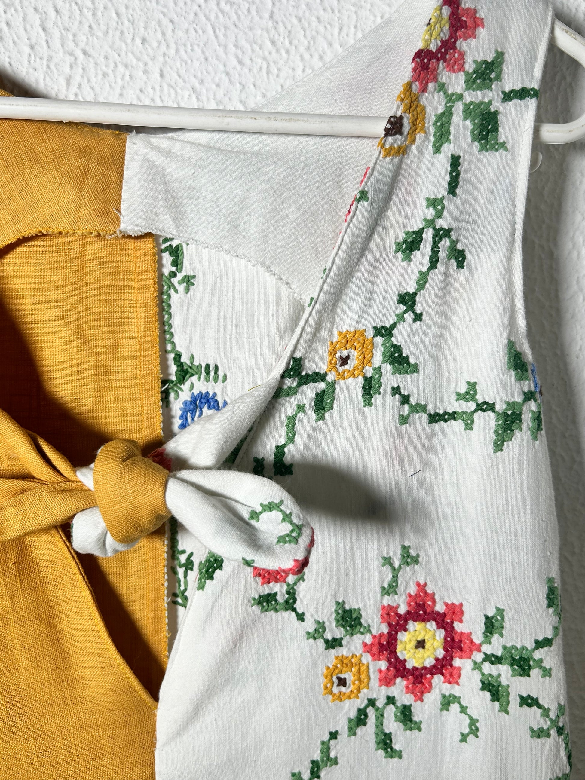 Macacão feito com uma toalha de mesa antiga bordada à mão e uma parte lisa 100% linho
